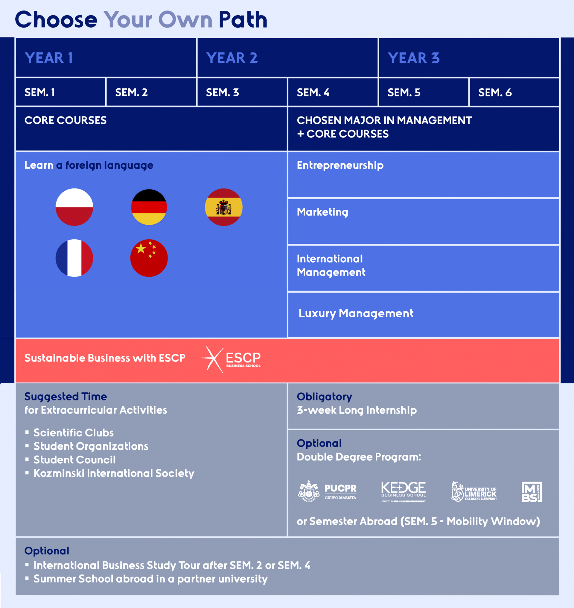 The Management Bachelor Degree at Kozminski University is enriched by its diversely structured curriculum, designed to equip students with an in-depth understanding and specialized skills across various sectors of managements (available majors), including: