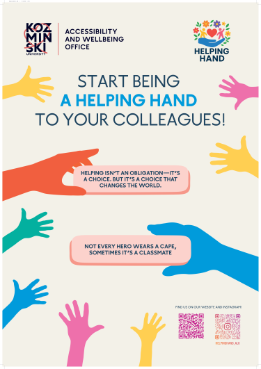 Program ma służyć każdemu studentowi, który potrzebuje wsparcia. Nie ma znaczenia czy czujesz się zagubiony/a, czy masz trudności z organizacją studiów, twoi koledzy z Programu Helping Hand pomogą Ci się odnaleźć w społeczności akademickiej.